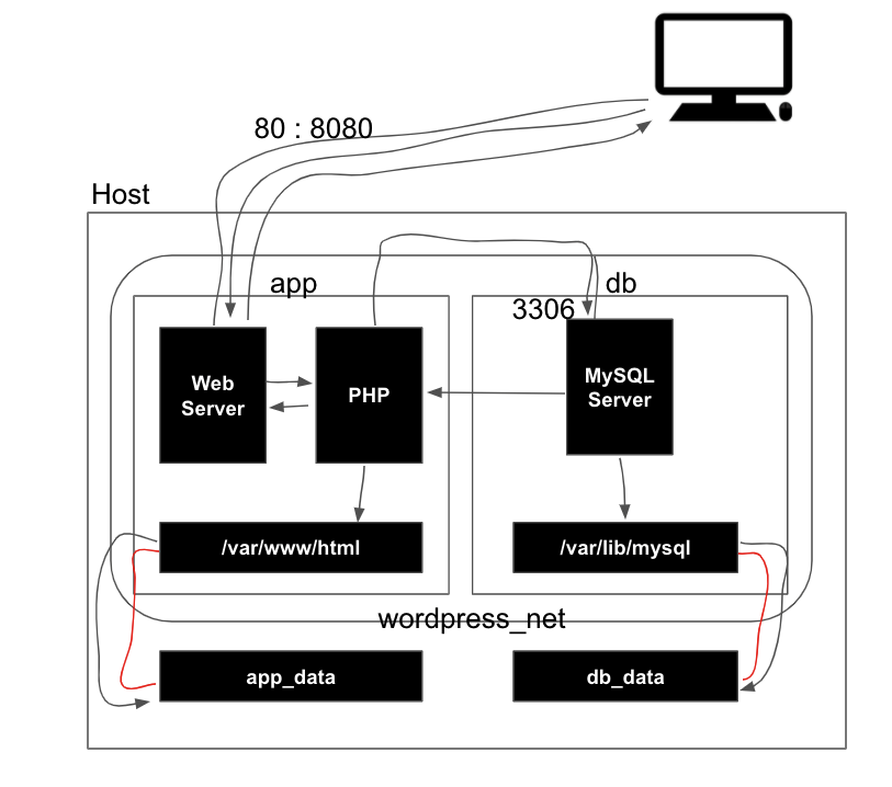 위 그림과 같이 클라이언트인 웹 브라우저가 있고 워드프레이스인 웹서버와 mysql DB 서버가 존재한다고 생각하고 도커를 통해 구축해보자.
