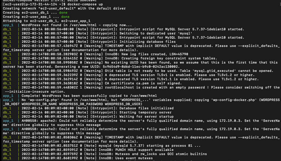 docker-compose up 명령어을 실행하면 이전에 세팅한 환경처럼 wordpress와 db가 실행되는 걸 확인할 수 있다.