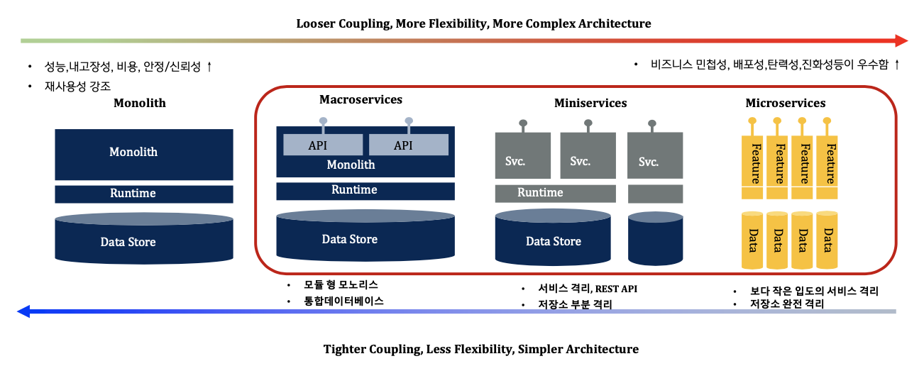 모노리스 시스템 -> 매크로서비스 -> 미니서비스 -> 마이크로서비스